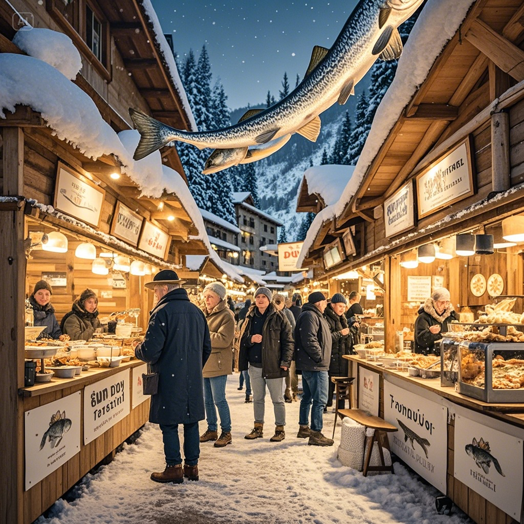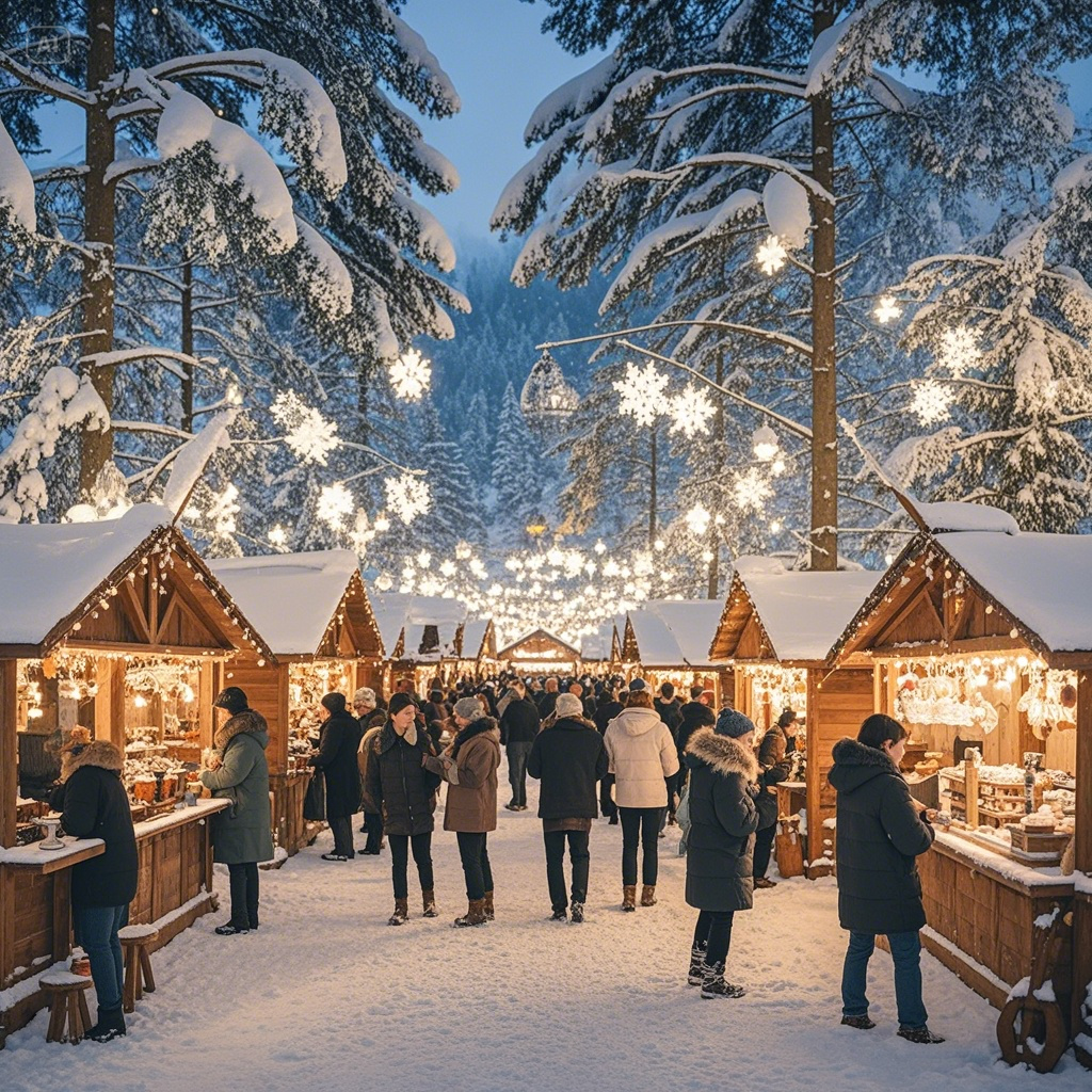 축제 장터에서는 지역 특산물과 따뜻한 겨울 음식을 구매할 수 있습니다.