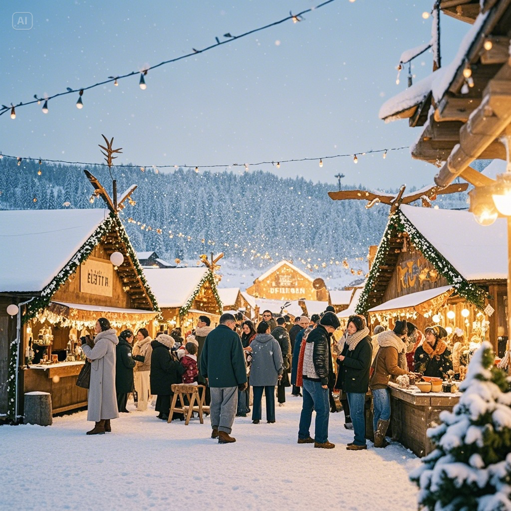 축제 장터에서는 지역 특산물과 따뜻한 겨울 음식을 구매할 수 있습니다.
